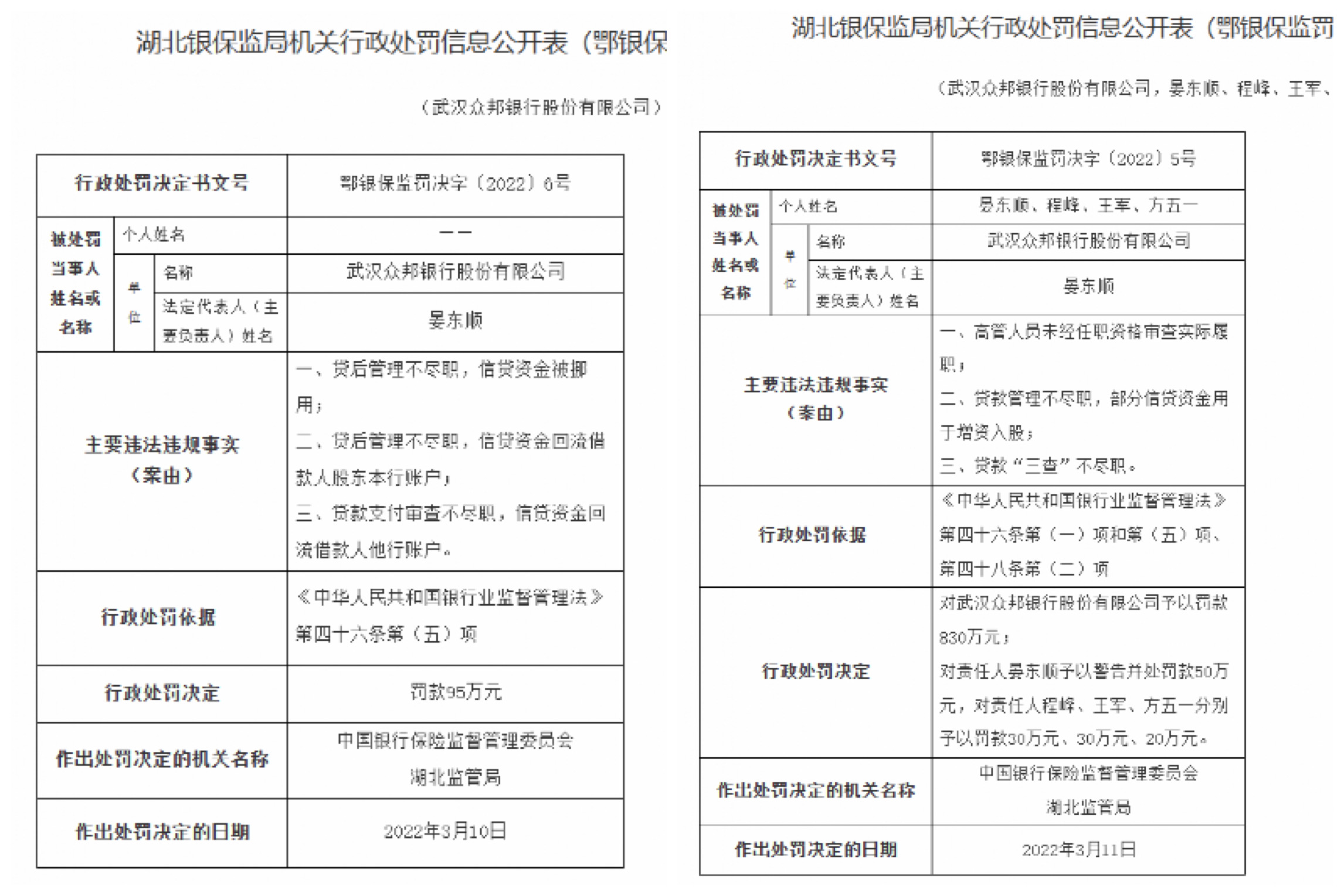 去年同日,众邦银行由于贷后管理不尽职,信贷资金被挪用;贷后管理不尽职,信贷资金回流借款人股东本行账户;以及贷款支付审查不尽职,信贷资金回流借款人他行账户等违法违规事实,再次被处以罚款95万元。