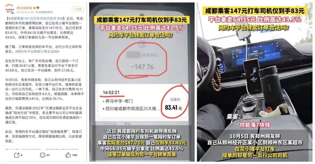 在30%抽成比例成为网约车行业公认隐形红线的背景下,一种通过跨平台转单实现的“分拆式抽佣”模式正悄然出现。据多地司机发布的订单信息显示,乘客实际支付费用与司机最终到手收入间存在明显差额,部分订单综合抽佣比例已突破40%,甚至达到50%。