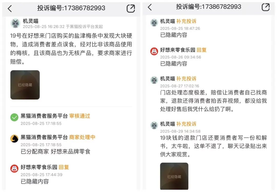 例如,一位消费者投诉称:“19号在好想来门店购买的盐津梅条中发现大块硬物,造成消费者差点误食,经对比非该商品使用的梅核,且该商品也为无核产品,要求商家进行赔偿。”