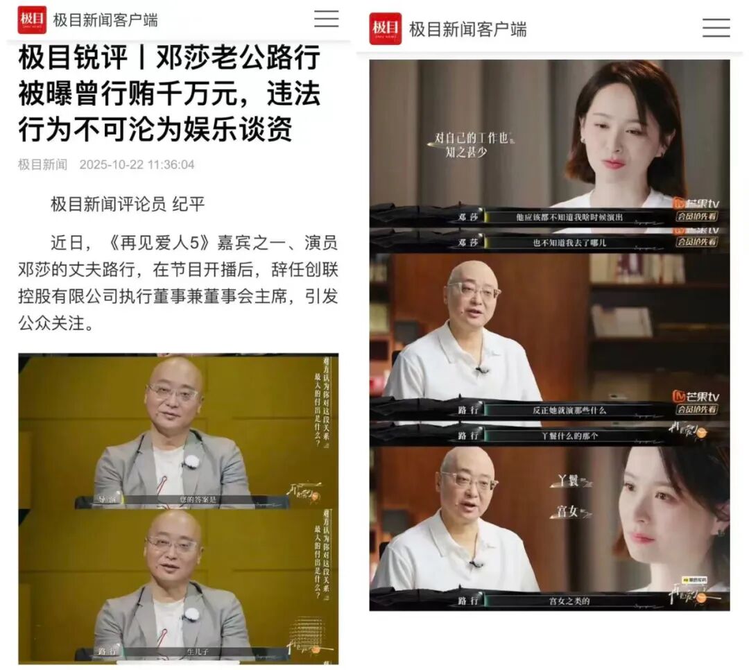 此前,节目嘉宾邓莎老公路行被曝行贿超千万元,但路行与节目组均未对此进行回应。
