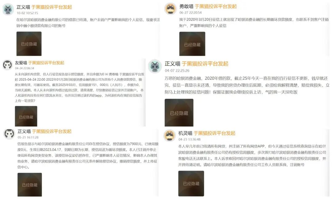 2023年5月,哈银消费金融又因“违反征信管理相关规定”被开出58万元罚单。尽管彼时哈银消费金融声称“已完成整改工作”,但黑猫投诉平台显示近期仍有不少用户反映征信混乱问题。