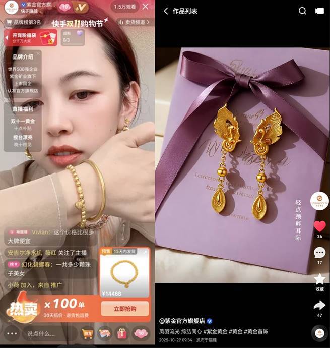 紫金黄金背靠紫金矿业,拥有原矿资源、款式设计、黄金珠宝新型工艺等全产业链优势。2021年双11期间,紫金黄金受到快手头部达人的邀请,在平台开启达人分销。