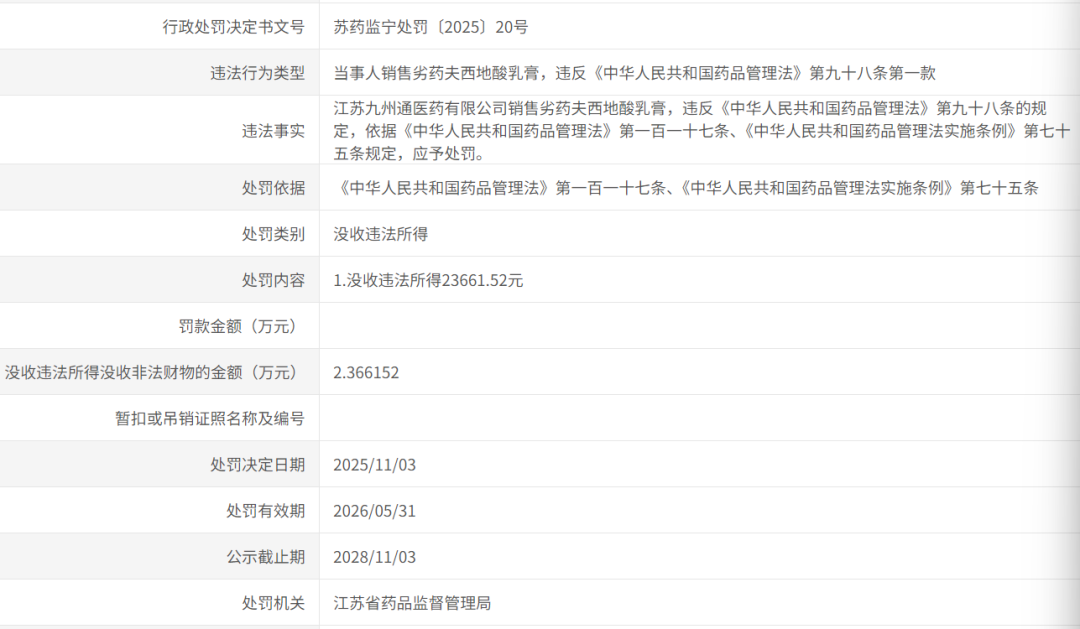 11月3日,江苏省药品监督管理局官网显示,江苏九州通医药有限公司销售劣药夫西地酸乳膏,违反《中华人民共和国药品管理法》第九十八条的规定,依据《中华人民共和国药品管理法》第一百一十七条、《中华人民共和国药品管理法实施条例》第七十五条规定,没收违法所得23661.52元。