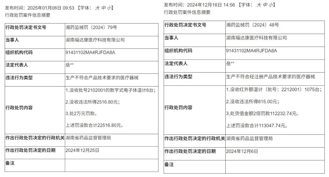 同时,九州通旗下生产企业也出现质量问题。例如,2025年1月6日,九州通旗下子公司湖南福达康医疗科技有限公司生产的数字式电子体温计不符合技术要求,被没收违法所得2516.8元并罚款2万元。2024年12月16日,湖南福达康医疗科技有限公司还因生产的红外额温计不符合经注册产品技术要求,被没收1075台并罚款11.3万元。