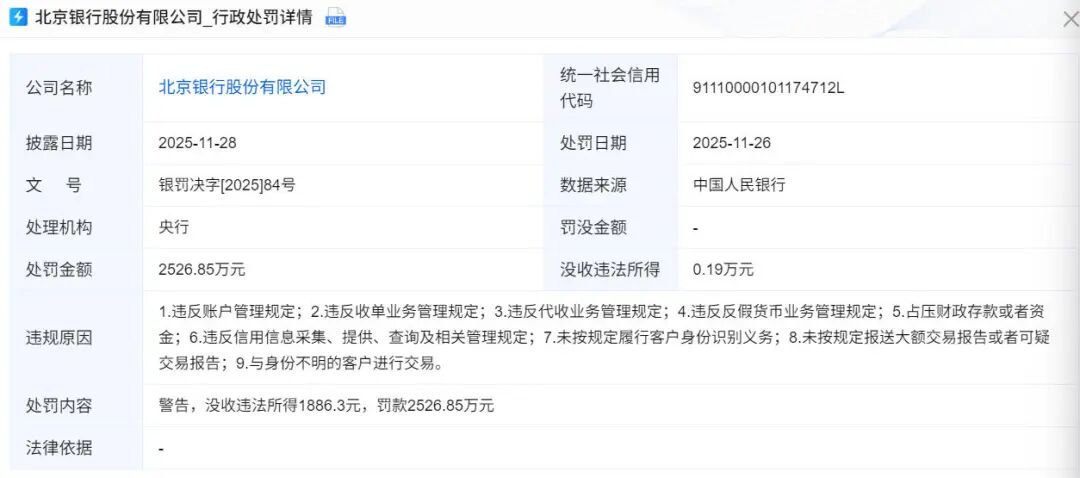 11月28日,北京银行因“违反账户管理规定;违反收单业务管理规定;违反代收业务管理规定;违反反假货币业务管理规定;占压财政存款或者资金;违反信用信息采集、提供、查询及相关管理规定;未按规定履行客户身份识别义务;未按规定报送大额交易报告或者可疑交易报告;与身份不明的客户进行交易”等9项违法违规行为,被监管部门警告、没收违法所得1886.3元,并罚款2526.85万元。同时,11名来自运营管理部、零售银行部、法律合规部等10个核心部门的责任人被处以1万至21万元不等的罚款,其中北京银行零售银行部侯某因4项违规被警告并罚款21万元。