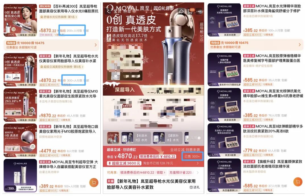 其次,产品性价比较低。岚至瞄准的是高端市场,其美容仪在淘宝旗舰店的售价为4599-9999元,对标国际一线品牌,但品牌力远不及雅萌、初普等。例如,淘宝平台的岚至旗舰店显示,一款销量较高的岚至超导枪(型号MT601)仅“已售300+”。此外,配套精华单盒价格399-1299元,但成分以玻尿酸、神经酰胺、肽等为主,并无稀缺性,且由宇肽生物(东莞)有限公司、诺斯贝尔化妆品股份有限公司等化妆品代工厂商生产。