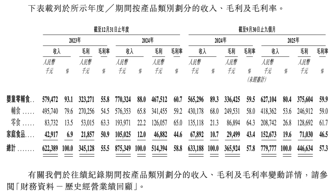 不过,SKU的快速扩容并未提升自有产能。招股书明确提到,“于往绩记录期间,我们的绝大部分产品由OEM供应商生产”,合作的OEM供应商数量达到62家,仅2025年10月在广州增城投产的基地生产少量果汁、食用油。这也就意味着,包括核心产品婴童辅食、水牛奶在内的产品几乎都为代工生产。