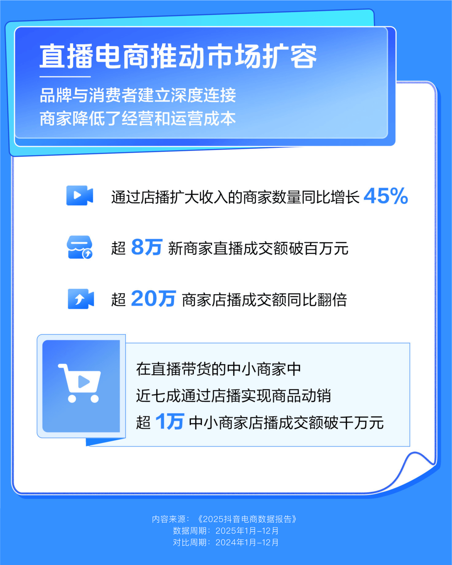 直播电商正在重塑商家与消费者之间的连接方式。通过常态化店播,品牌和商家能够直接触达消费者,实时展示商品信息、回应消费需求,在降低获客和运营成本的同时,提高交易转化效率。数据显示,2025年,通过店播实现收入增长的商家数量同比增长45%,一批新商家在较短时间内实现经营规模跃升,超过8万个新商家直播成交额突破百万元。