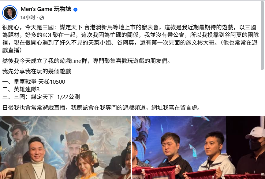 查阅相关网站信息显示,《三谋》此次官方举办的活动中,首度公开游戏官方主题曲MV及品牌宣传片,并且公布游戏上市后新内容,并且汇集了《三谋》官方团队、台湾电竞协会理事长、KOL等知名人士。参与此次活动“Men's Game 玩物誌“在国外社交网站Facebook拥有18万粉丝,在他的活动图片中,面带笑容的谷阿莫手持官方赠予的旗帜,作为盟主代表接受官方的表彰。