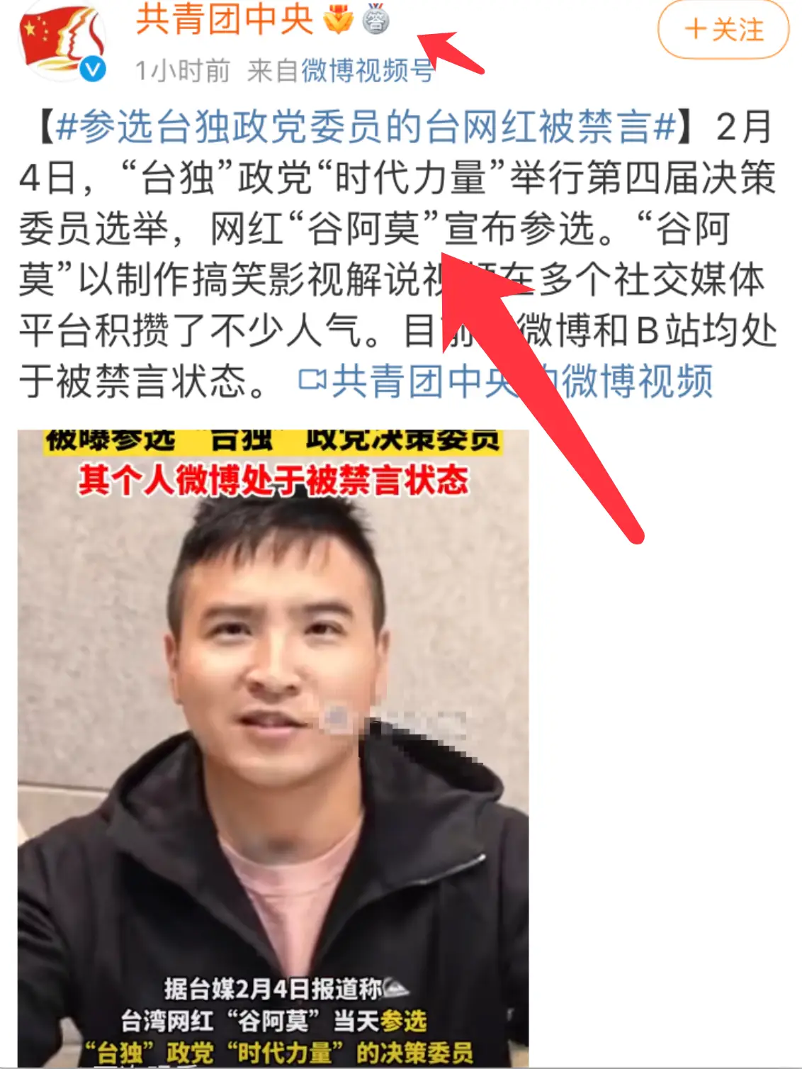 彼时,共青团中央账号一度公开发文:网红“谷阿莫”因宣布参选“时代力量”第四届决策委员选举而被多家禁言。封禁前,“谷阿莫”以制作搞笑影视解说视频在多个社交媒体平台已积攒了上千万粉丝。此事曝光后,不少粉丝称“不可原谅”“吃饭砸碗”行为。