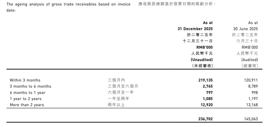 与此同时,截至2025年12月底,江南布衣的应收账款也高达2.21亿元,相较2025年6月底的1.26亿元飙升75.4%,远高于营收增速。其中,三个月以内应收账款规模为2.19亿元,占总规模的92.4%。