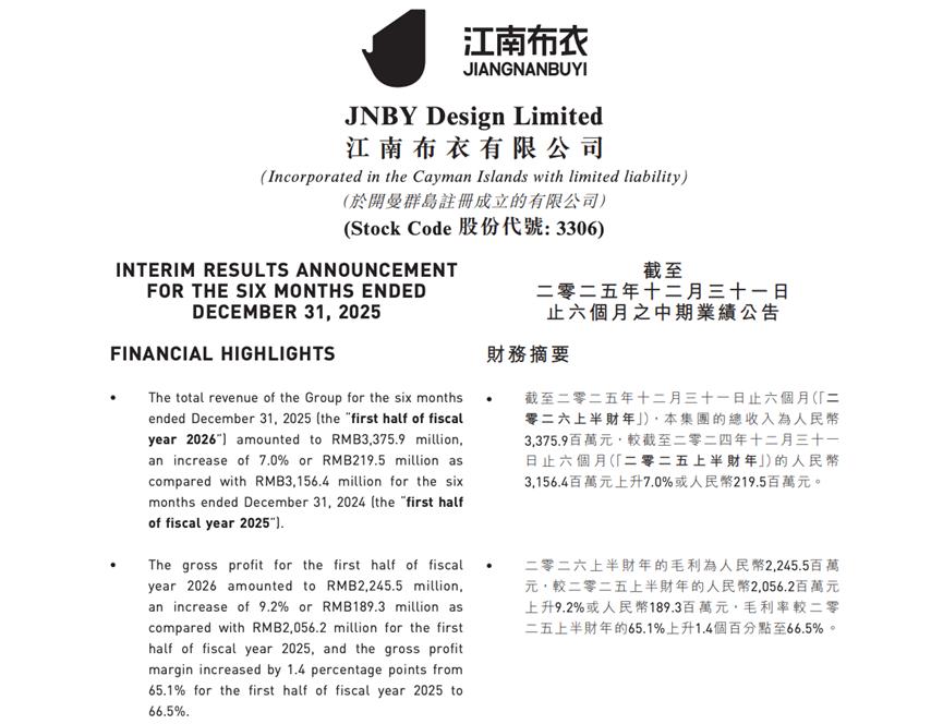 2026年2月26日,江南布衣披露2026上半财年(截至2025年12月31日止六个月)财报,营收33.76亿元,同比增长7%;净利润6.76亿元,同比增长11.9%;毛利率66.5%,同比上涨1.4个百分点。