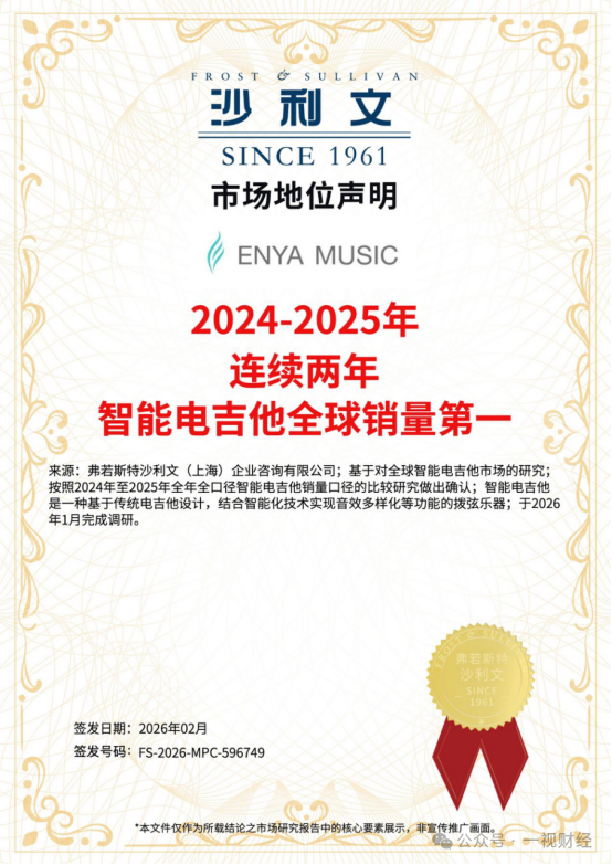 全球市场的强力反馈:这种对产品底层逻辑的重构,已在市场层面转化为极具说服力的增长数据。权威咨询机构弗若斯特沙利文(Frost & Sullivan)的调研显示,恩雅智能电吉他在2024年至2025年已实现连续两年全球销量第一。这一数据不仅验证了其“一体化设备”策略对传统门槛的有效拆解,更标志着智能电吉他已获得全球消费市场的广泛认可。