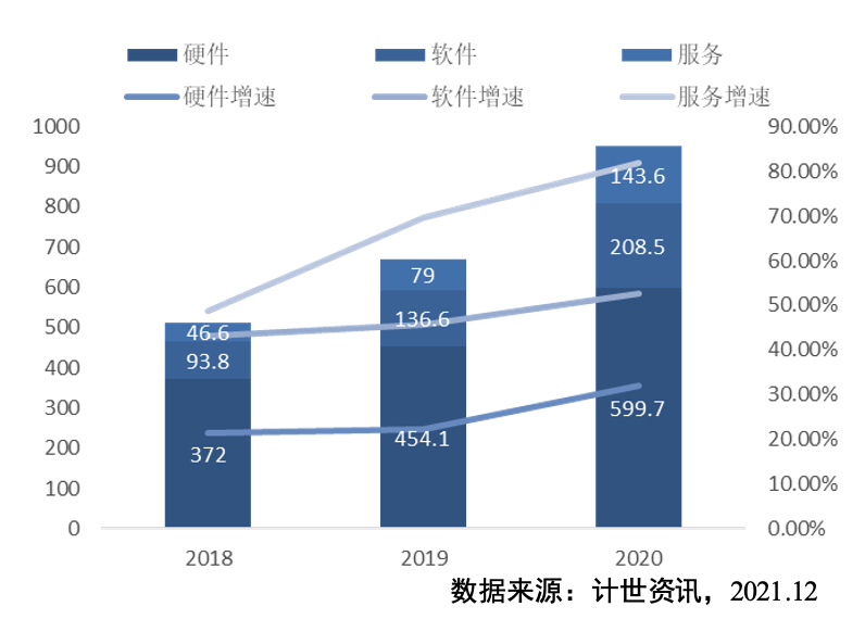 从市场结构看,私有云市场目前依然是硬件占据主导地位,2020年硬件市场规模达到599.7亿元,占私有云市场的63.0%。软件及服务市场在私有云市场中的占比快速持续提升。2020年私有云软件市场规模208.5亿元,占比21.9%,服务市场规模达143.6亿元,占比15.1% 。