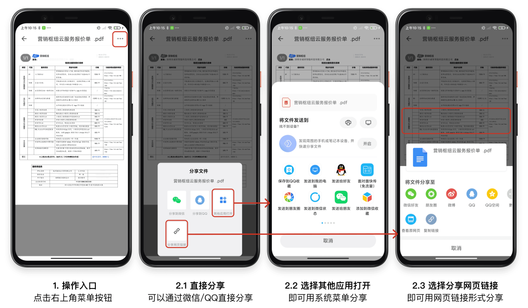 如下图所示,点击图1中红框区域,即可调起文件分享菜单,在分享菜单中可以选择:- 其他应用打开: 调起系统分享/操作菜单,来进行手机系统所提供的更多操作
