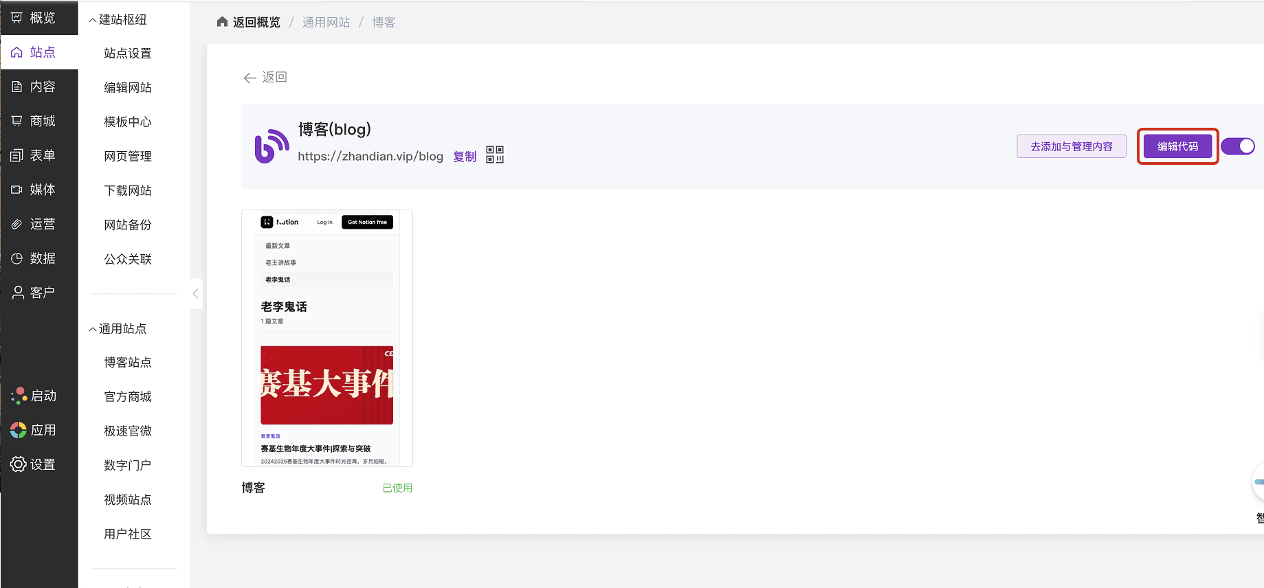 我们的官方博客,是通过“站点智能”营销枢纽系统一键开通的。其技术底座是HTML单页应用,这意味着整个站点的结构和功能都可以通过直接编辑HTML代码来灵活调整。