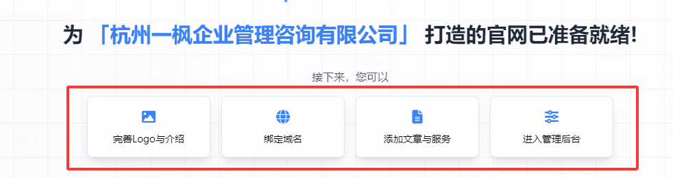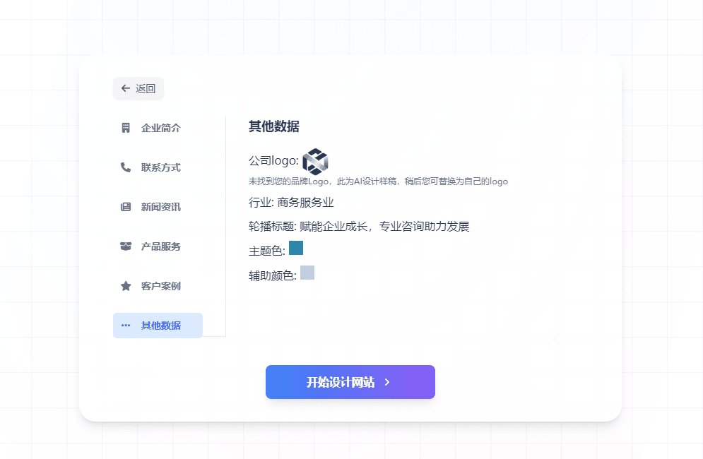 品牌视觉统一站点风格,若 AI 设计的 Logo 不符合需求,可先使用默认样式,后续在 “完善 Logo 与介绍” 模块上传自有 Logo;确认主题色、辅助色是否匹配品牌调性(如科技类用蓝色,教育类用橙色):