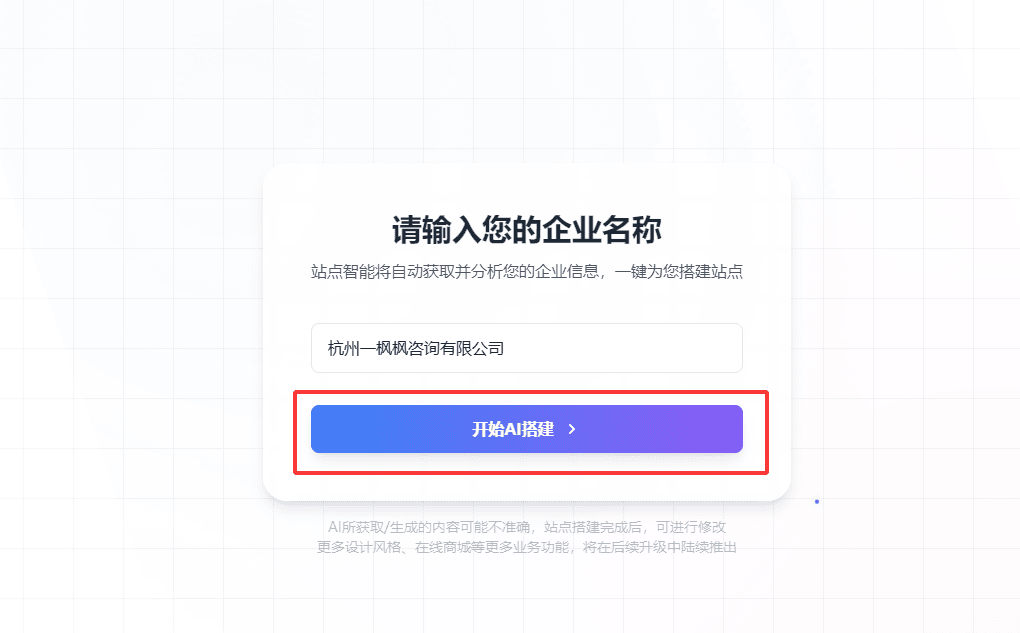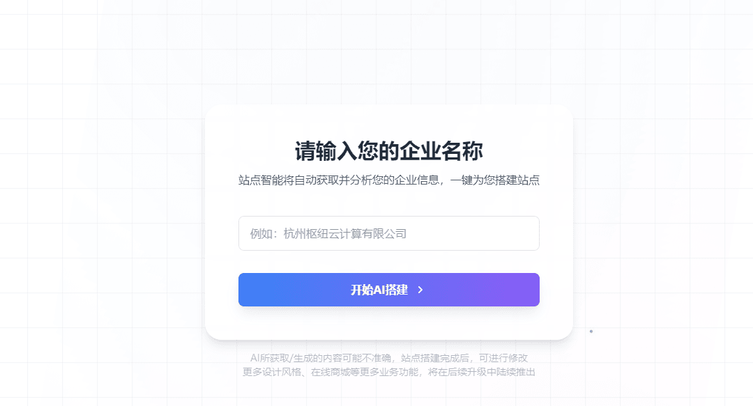 在提示框输入企业名称→ 点击 “开始 AI 搭建”,名称格式建议使用完整企业全称(如 “杭州枢纽云计算有限公司”),避免简称(如 “枢纽云”),确保 AI 准确抓取工商信息(注册资本、经营范围等)