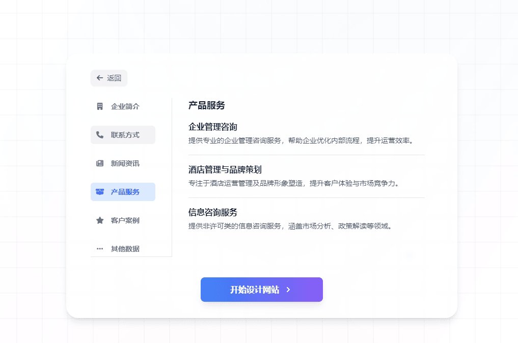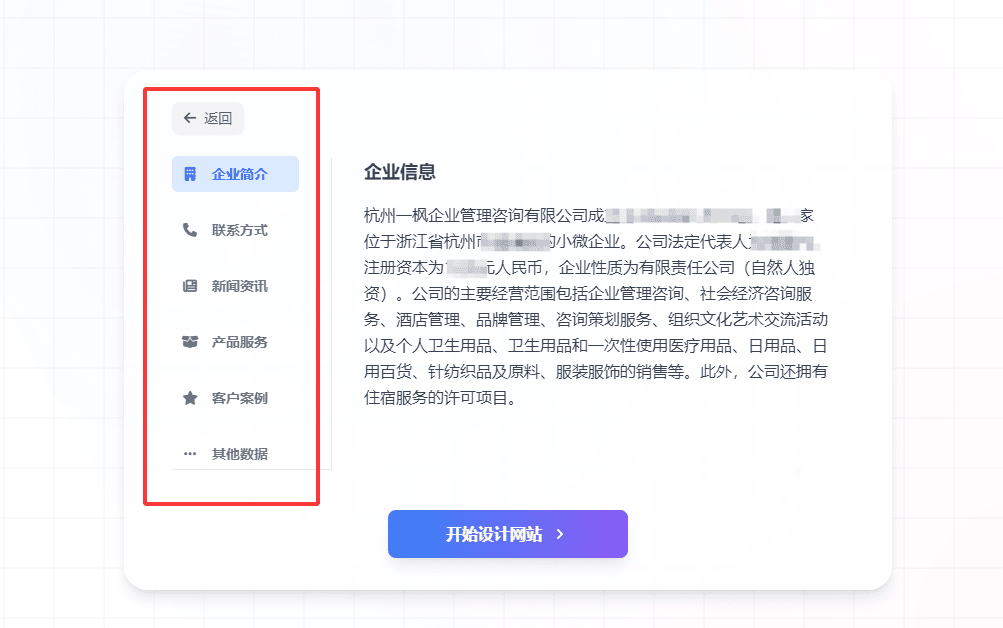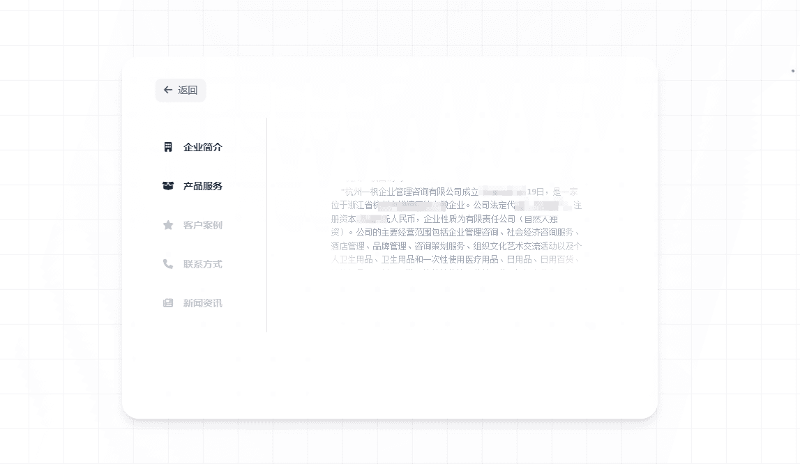 AI 驱动 “精准内容生成”。不再是 “笼统抓取信息”,而是基于企业名称深度分析行业属性(如 “杭州一枫咨询” 自动匹配 “商务服务业” 标签),生成符合行业逻辑的企业简介、产品服务描述。例如咨询类企业自动关联 “战略规划”“运营优化” 等业务方向,减少后期修改成本。