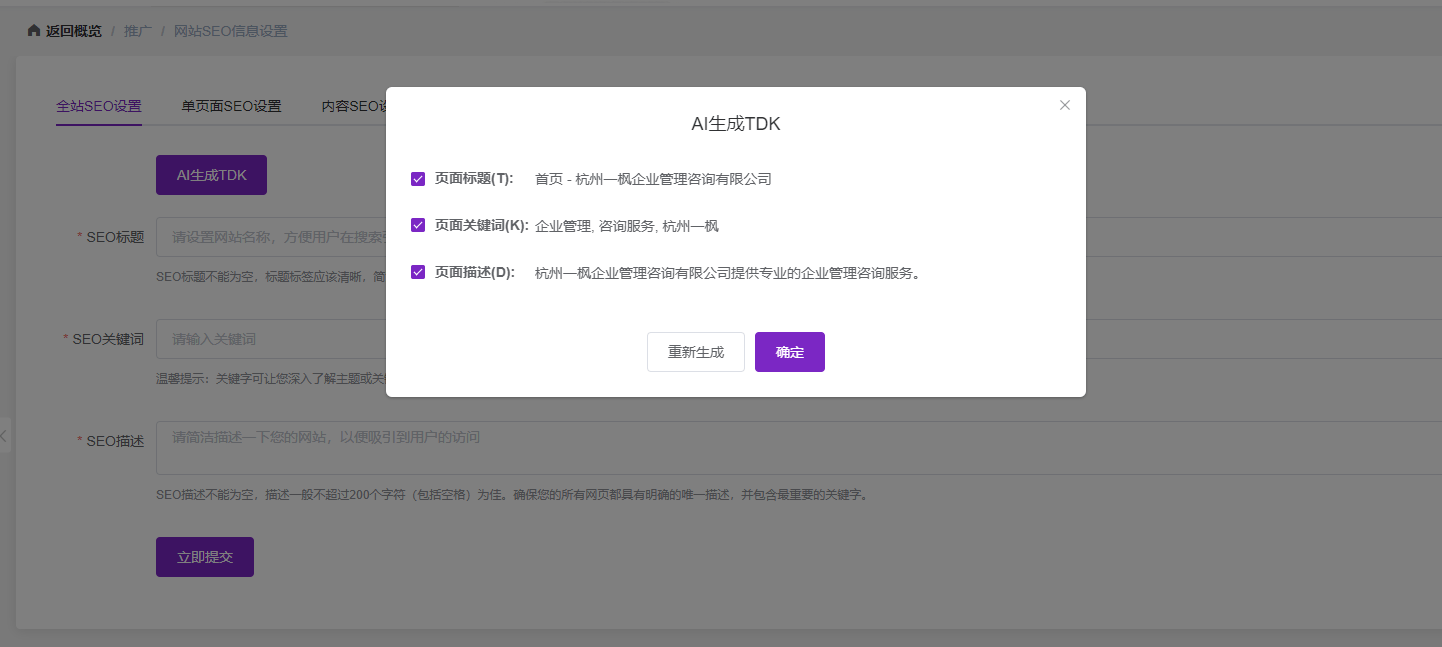 页面关键词(K):AI 默认生成 3-5 个关键词,可补充行业词,提升搜索排名