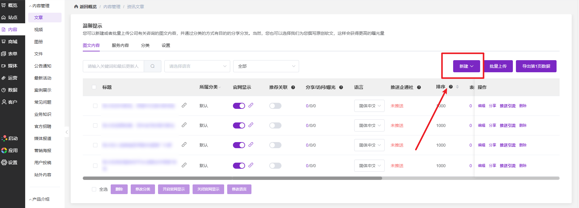 在 “添加文章与服务” 模块上传产品详情、行业干货文章,增加站点页面数量,同时提升 SEO 权重: