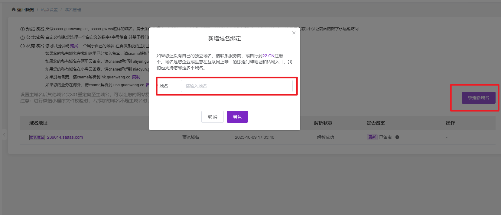 进入 “绑定域名” 模块,按提示完成域名解析,替换临时域名,提升品牌专业性:
