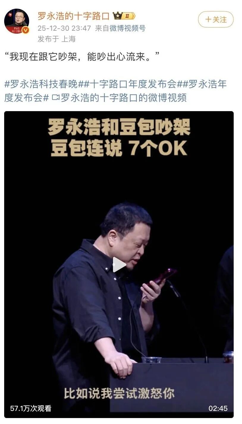 2025年倒数第二天,罗永浩暌违7年的“科技春晚”回归之战充满波折——开场迟到47分钟、视频播错、PPT备注未删净、伴奏突然中断。但这场被网友戏称为“灾难级”的年度科技创新分享大会,却因一场不到5分钟的人机辩论重回正轨。