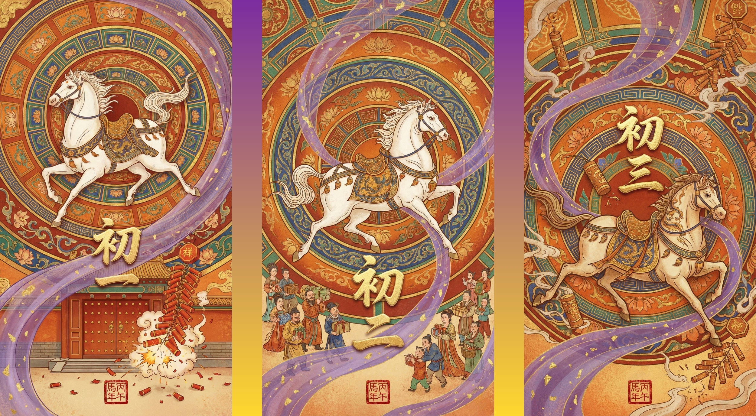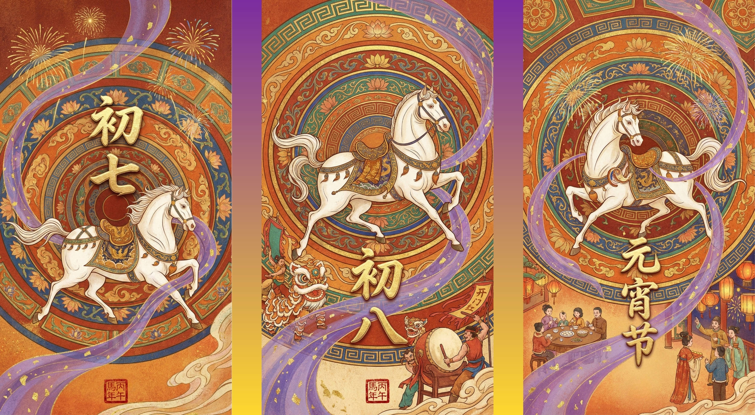 春节全周期覆盖:这不仅仅是单一的拜年图片,而是一套完整的春节主题海报,覆盖春节全周期,从除夕到初八,以及元宵节这种重要节日,每一天都能带给您不同的视觉惊喜。