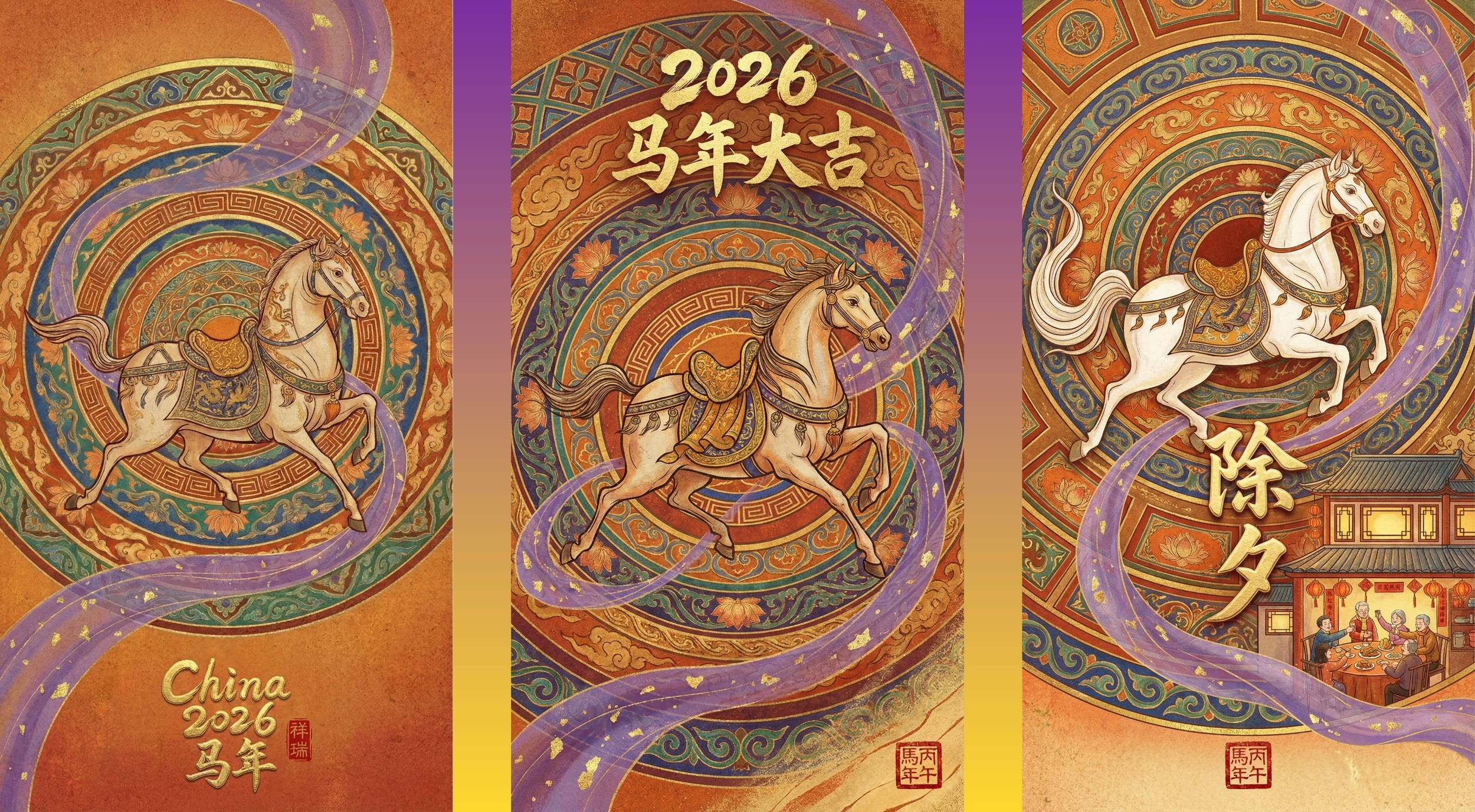 寓意非凡的图腾: 我们从敦煌壁画中汲取灵感,选取了“天马”这一代表飞跃与力量的元素。寓意着您的企业在2026年“骏马腾飞、宏图大展”,充满无限潜力与创造力。不仅传递传统文化的厚重祝福,也融入了现代商业精神,展现企业进取与创新的态度。