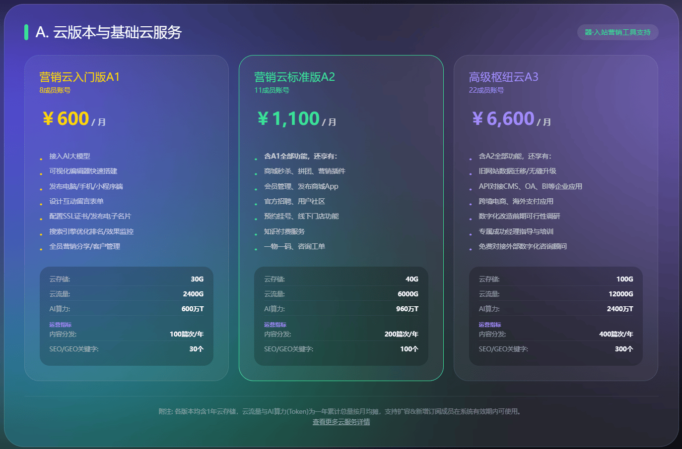 资源配置:40G 云存储(1 年)、6000G 云流量 / 年、960 万 T AI 算力 / 年、年度内容分发 200 篇次、SEO/GEO 关键字 100 个