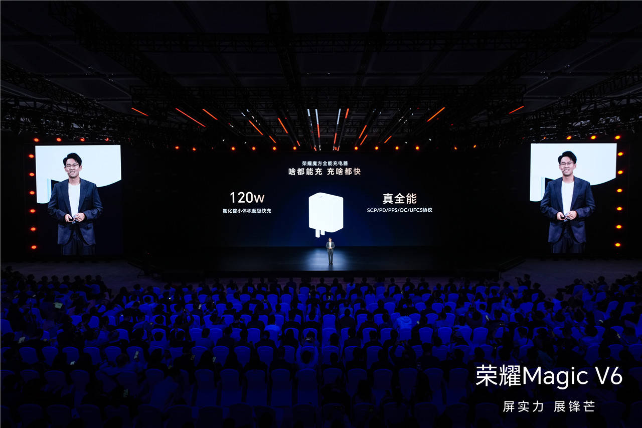 这次荣耀Magic V6全系标配120W氮化镓(GaN)魔方全能充电器,体积比传统120W充电器小30%,便携性拉满,插脚可折叠,支持SCP、PD、PPS、QC、UFCS融合快充全主流协议,出差旅行不用带一堆充电头,彻底告别充电焦虑。