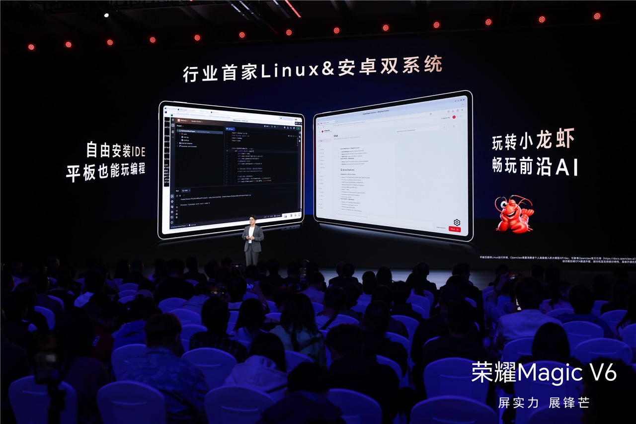 整场发布会看下来,荣耀Magic V6把折叠屏用户最在意的耐用性、续航、轻薄、智慧体验全部做到位,补齐了折叠屏所有短板,真正做到了全满贯。从折叠屏到 AI 生态,从实用体验到前沿科技,荣耀这一步走得稳、准、狠。未来已来,不是概念,而是握在手里的真实体验。再加上荣耀Robot Phone和荣耀Robot官宣、龙虾宇宙生态落地,行业首家Linux+安卓双系统官宣。荣耀已经不只是在做手机,而是在构建一套真正面向未来的全场景智能终端体系。