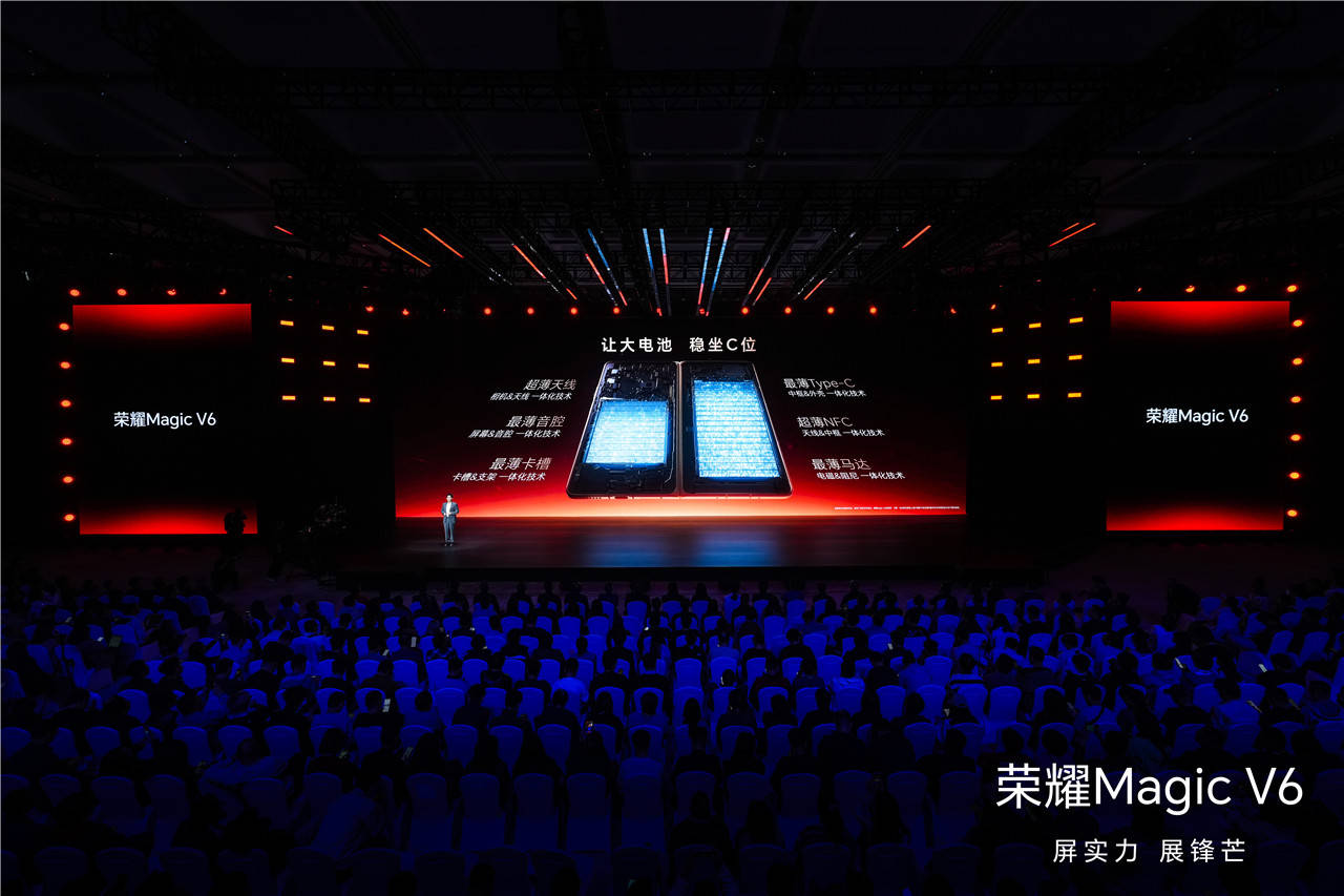荣耀也分享了如何让大电池稳坐C位,超薄天线、最薄音腔、最薄卡槽、最薄Type-C、超薄NFC、最薄马达的一体化技术的加持。并且行业少见的支持IP68+IP69双防尘防水,防水深度达到4米,彻底告别折叠屏娇贵的标签。