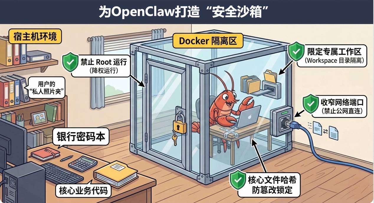 为了帮助企业团队和OPC(一人公司)创业者在保障安全的前提下使用AI智能体,360在《指南》中提出“先可控、再提效”的原则。针对个人开发者和小型团队,指南建议避免直接在本机高权限运行智能体,而是通过容器化技术构建隔离环境,并结合最小权限策略、密钥加密注入和关键配置文件防篡改等措施,为OpenClaw搭建安全运行基础,从而在不增加复杂度的情况下有效降低风险。
