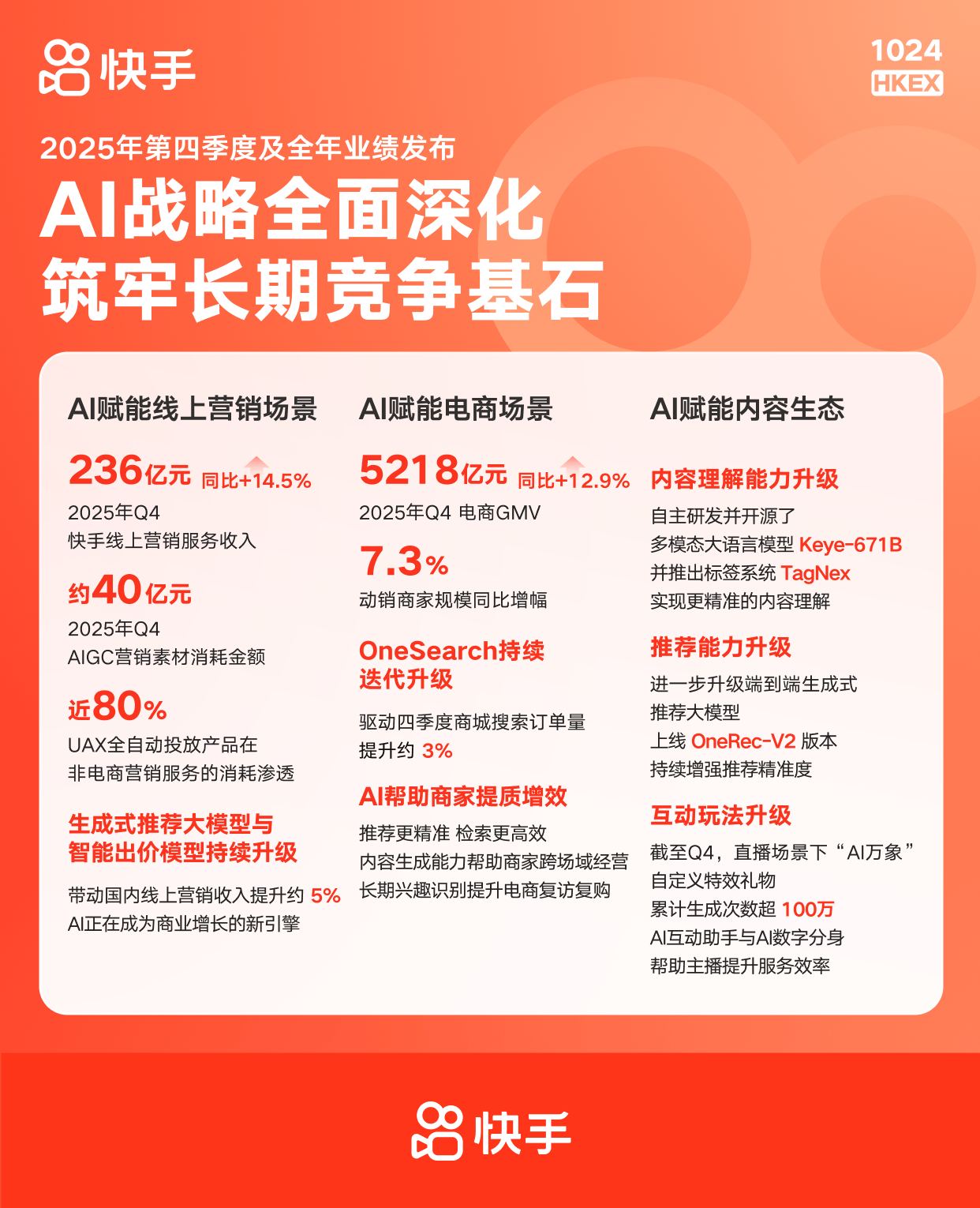 在电商业务方面,2025年第四季度,快手电商GMV同比增长12.9%至5218亿元。端到端生成式检索架构 OneSearch持续迭代升级,驱动商城搜索订单量提升约3%;推荐、检索、内容生成、长期兴趣理解与订单AI诊断等能力持续落地,帮助商家提升跨场域经营能力、优化转化效率和经营质量。