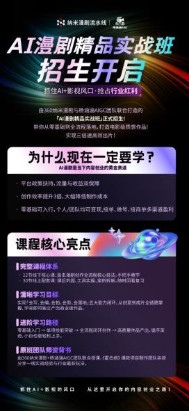 在培养方式上,本次课程采用小班制项目实训模式,由360官方技术专家驻场解决工具与流程问题,杨涵涵导演团队提供创作方法论指导与行业经验支持。学员结业后将完成完整项目级作品集,可直接用于求职或承接商业项目,实现从学习到进入制作一线的能力转化,打通AI漫剧人才培养与产业需求之间的连接通道。