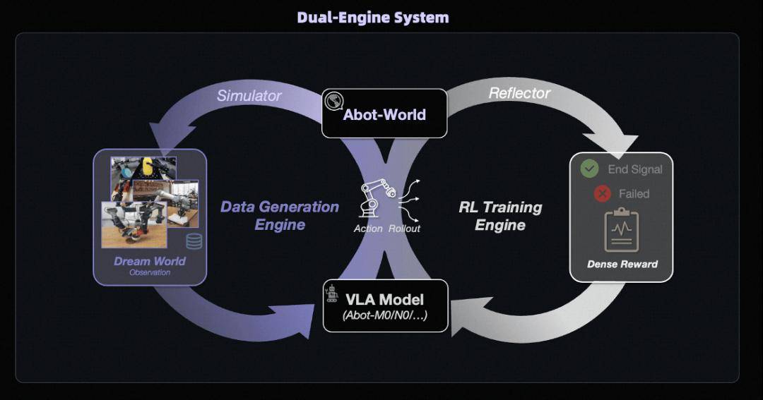 作为数据层的核心, ABot-World通过批量合成 Video、Depth、Point Cloud、Trajectory 四类训练数据,配合RL Training Engine在虚拟环境里定义奖惩、反复试错。模型以高保真仿真替代高昂的真机采集,从而弥合Sim-to-Real鸿沟,将数据成本压缩数个数量级。