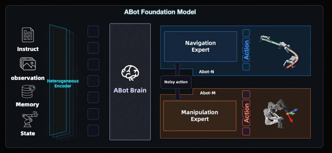 若将ABot全栈体系视为具身智能的“运行大脑”,ABot-N与ABot-M便是其“运动双核”,分别掌管机器人的“双腿”与“双手”,直接响应物理世界中“去哪里”与“做什么”的基础指令。依托统一架构设计,高德打造出可解耦和协同的专用基座模型,突破跨形态适配与跨任务泛化的技术瓶颈。
