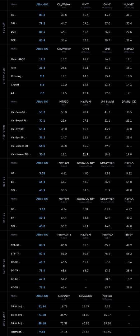 ABot-N推出后,迅速在VLN-CE(R2R/RxR)、HM3D-OVON、EVT-Bench等7大权威基准上全面刷新SOTA,并在导航精度、社会合规性、zero-shot泛化实现断层式领先。