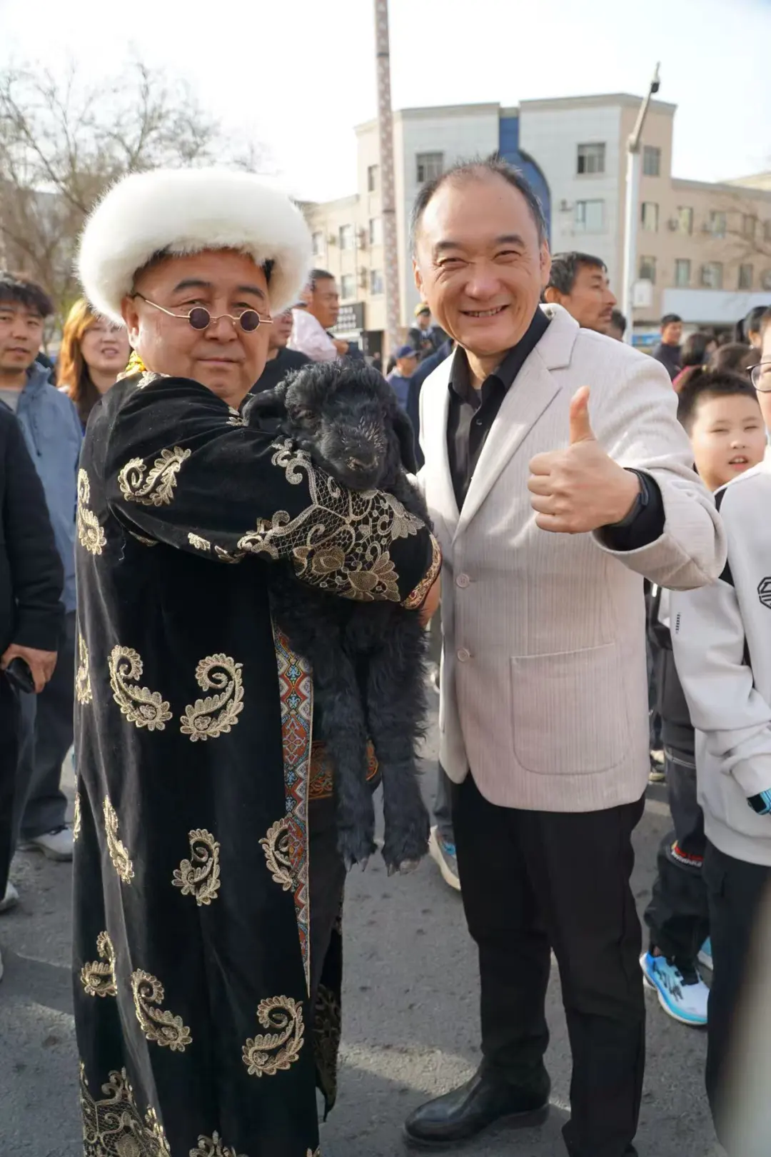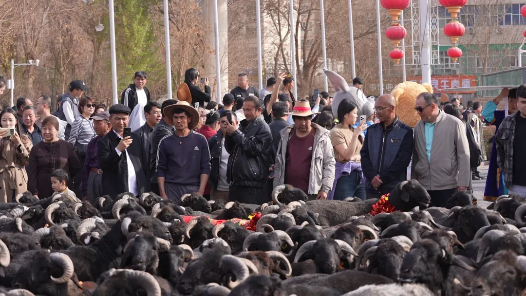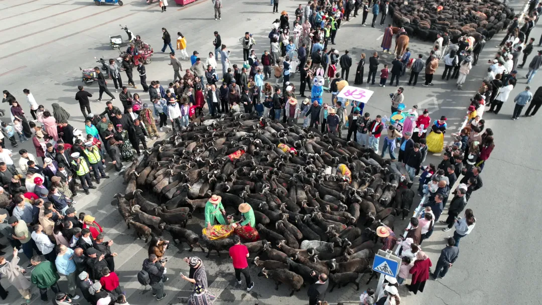 这是全国首次、规模最大的黑羊巡游。身披艾德莱斯绸、颈挂铃铛的头羊们,以昂扬的姿态引领羊群,向沿途市民游客致以春日问候。