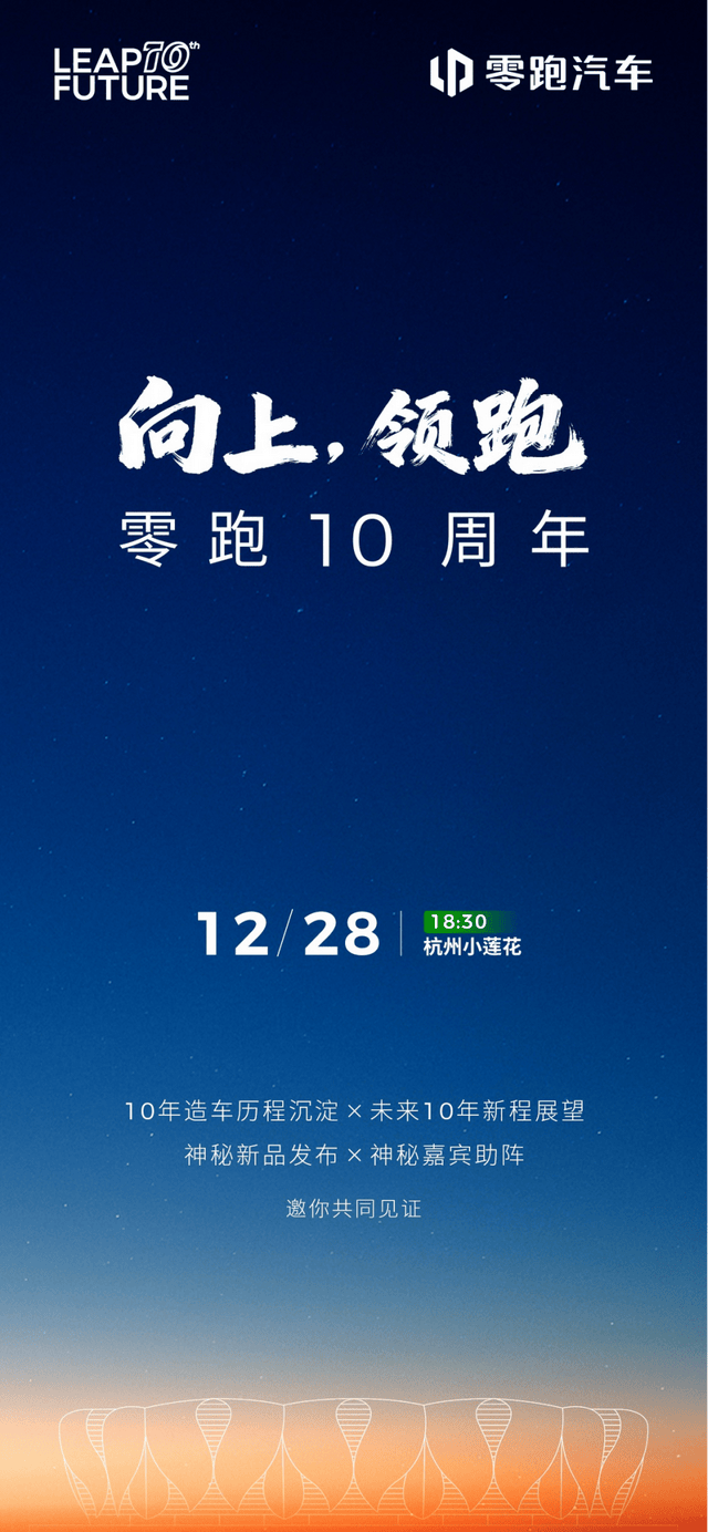 同时,零跑汽车宣布将于12月28日在杭州奥体中心体育馆(小莲花)举办以“向上,领跑”为主题的十周年发布会。在成立十周年这一重要节点,零跑汽车盛情邀请十年来砥砺同行的员工代表、用户代表、伙伴代表、投资方代表等,共同见证这一凝聚过往、开启未来的历史性时刻。