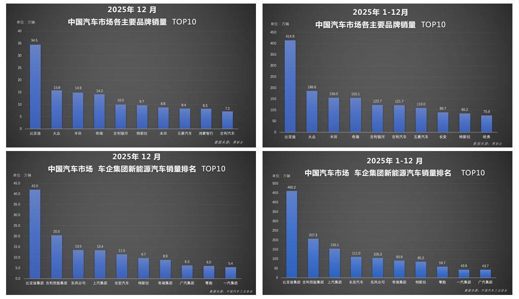 随着2025年圆满收官,中国汽车市场交出年度成绩单。行业数据显示,比亚迪在12月及2025年全年中国汽车市场品牌销量、新能源销量、集团销量等多个核心维度均位列第一。并连续四年蝉联全球新能源车市场销量冠军、中国汽车市场品牌四连冠,以实力问鼎全球市场。