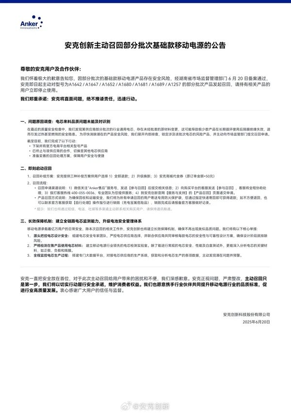 危机发生后,安克创新紧急启动全球化召回程序,在中国、美国、日本等多个核心市场同步开展大规模产品召回。