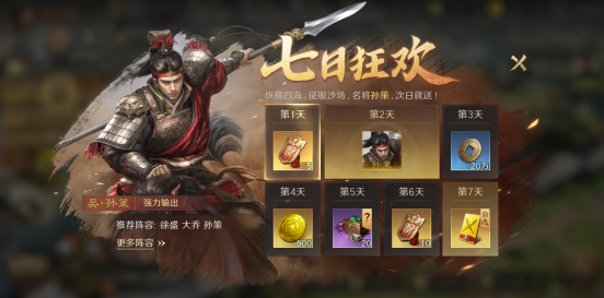海量福利也是游戏的一大亮点。创建角色就能领取全服预约奖励,里面有橙将和资源,这开局就给了咱们很大的优势。七日狂欢活动更是让人期待,次日送橙将孙策,后续还有自选战法包。开服前七天还免费送125抽卡券、2480黄金及橙将战法。