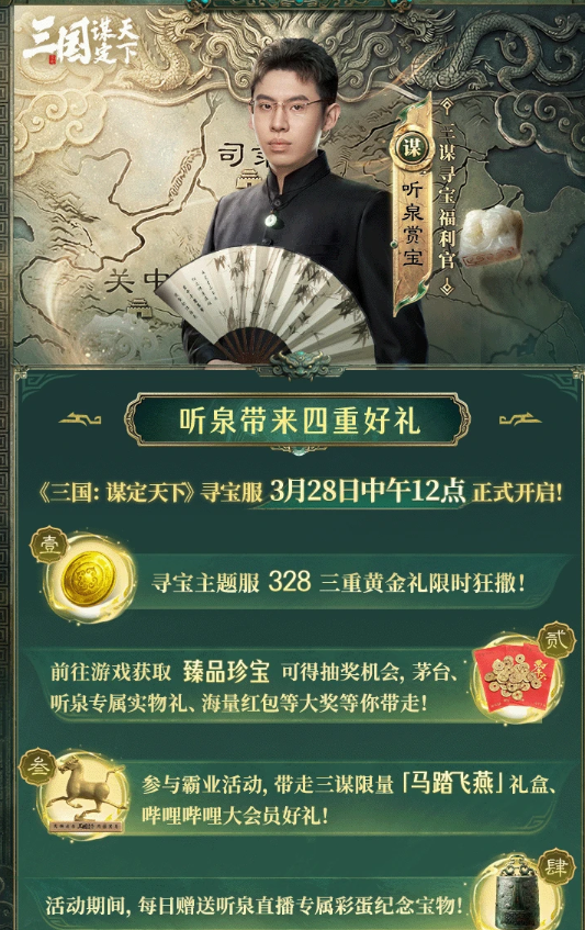 这次的双重联动更是加码了乐趣,「品宝论英」联动西安博物院,把汉文化融入了寻宝玩法,本来三国就是承接汉代,玩策略的同时还能足不出户云逛博物馆赏汉代文物,文化氛围感一下子就出来了,还有黑撒乐队和兰音做的陕味单曲,接地气又有意思。联动听泉赏宝开的寻宝新服,参与活动就有机会抽海量黄金、B站大会员还有专属神秘好礼,福利到位。