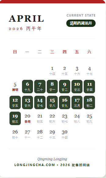 我们坚持“品质、纯正”的理念,完全顺应大自然的节气来制定我们的采摘与发货标准。为了让大家清晰地了解手中的茶处于哪个绝佳的状态,我们在此分享Longjingcha.com专属的2026年采茶时间线:
