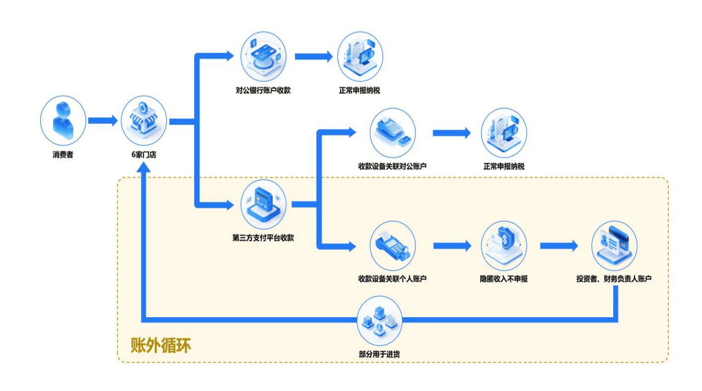 营业款先进入员工个人账户,再转出至投资人、财务负责人个人账户,最终仅部分资金转入对公账户用于进货及门店运营,形成完整的资金隐匿闭环。