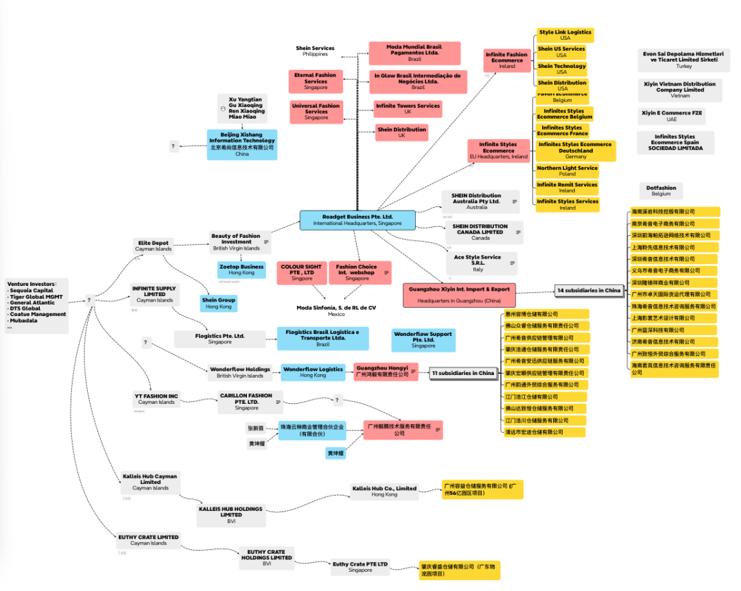 公开信息显示,Shein的全球业务核心主体是新加坡注册的ROADGET BUSINESS PTE. LTD.,这家公司通过股权控制,直接掌握着国内核心实体广州希音国际进出口有限公司的决策权,包括中国供应链的采购标准、订单分配与定价规则。也就是说,Shein的核心供应链与运营环节仍扎根中国,但营收与利润却集中流向了新加坡。
