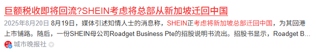 为了推进赴港上市,2025年8月市场传出Shein“考虑将总部从新加坡迁回中国”的消息。但截至10月,这一计划仍无实质性进展。这意味着Shein的跨境税务合规风险仍在。