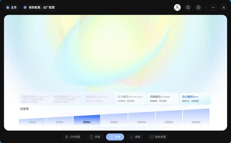 狂暴竞技模式:适用于职业电竞、高端FPS游戏,扫描帧速率高达20000FPS,保证每一击的精准反馈。竞技超核模式:适合高强度的天梯排位、竞技游戏,帧速率超过13000FPS,确保激烈对抗中的流畅体验。超核模式:适合大多数MOBA/RPG游戏,动态扫描帧速率适应各种复杂的操作。火力模式:平衡性能与续航表现,适合长时间使用。均衡模式:适合日常游戏、影音娱乐。